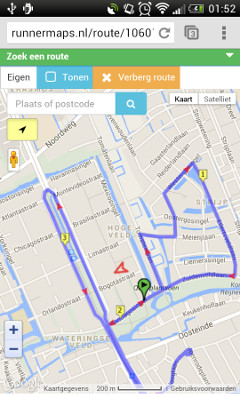 Hardlooproutes maak je door simpelweg op de kaart te klikken, en nogmaals op de punten waar je langs wilt lopen. Standaard worden hierbij voetgangersroutes gevolgd, maar je kunt ook kiezen voor fietsroutes (meestal doorgaande fietspaden, soms wat langer dan de voetgangersroute) of rechte lijnen. Rechte lijnen zijn belangrijk als je over een pad loopt dat niet op Google Maps staat. Je kunt dan vaak op de satellietbeelden zien waar het pad loopt, en deze met lijnstukjes toevoegen aan de route.